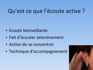 L'écoute active est une technique d'accompagnement qui implique une écoute bienveillante et attentive pour favoriser l'expression de l'autre. Elle nécessite d'exclure les idées préconçues, de poser des questions précises et d'utiliser des outils comme la reformulation et la synthèse pour valoriser la communication. Des stratégies variées s'appliquent selon le contexte, que ce soit en personne, en groupe ou lors d'interactions plus formelles.