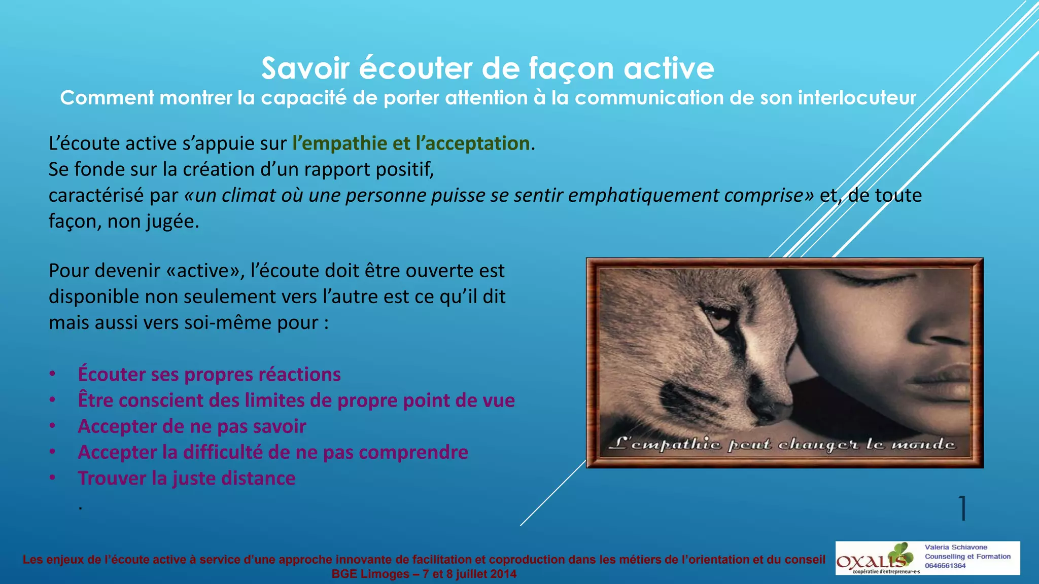 Le document aborde l'importance de l'écoute active dans le cadre de la facilitation et de la coproduction dans les métiers de l'orientation et du conseil. Il souligne que l'écoute doit être empathique et sans jugement pour créer un climat de confiance, favorisant l'expression et la compréhension. Les éléments clés d'une bonne écoute incluent la suspension des jugements, l'empathie, et la création d'un espace propice à la communication.