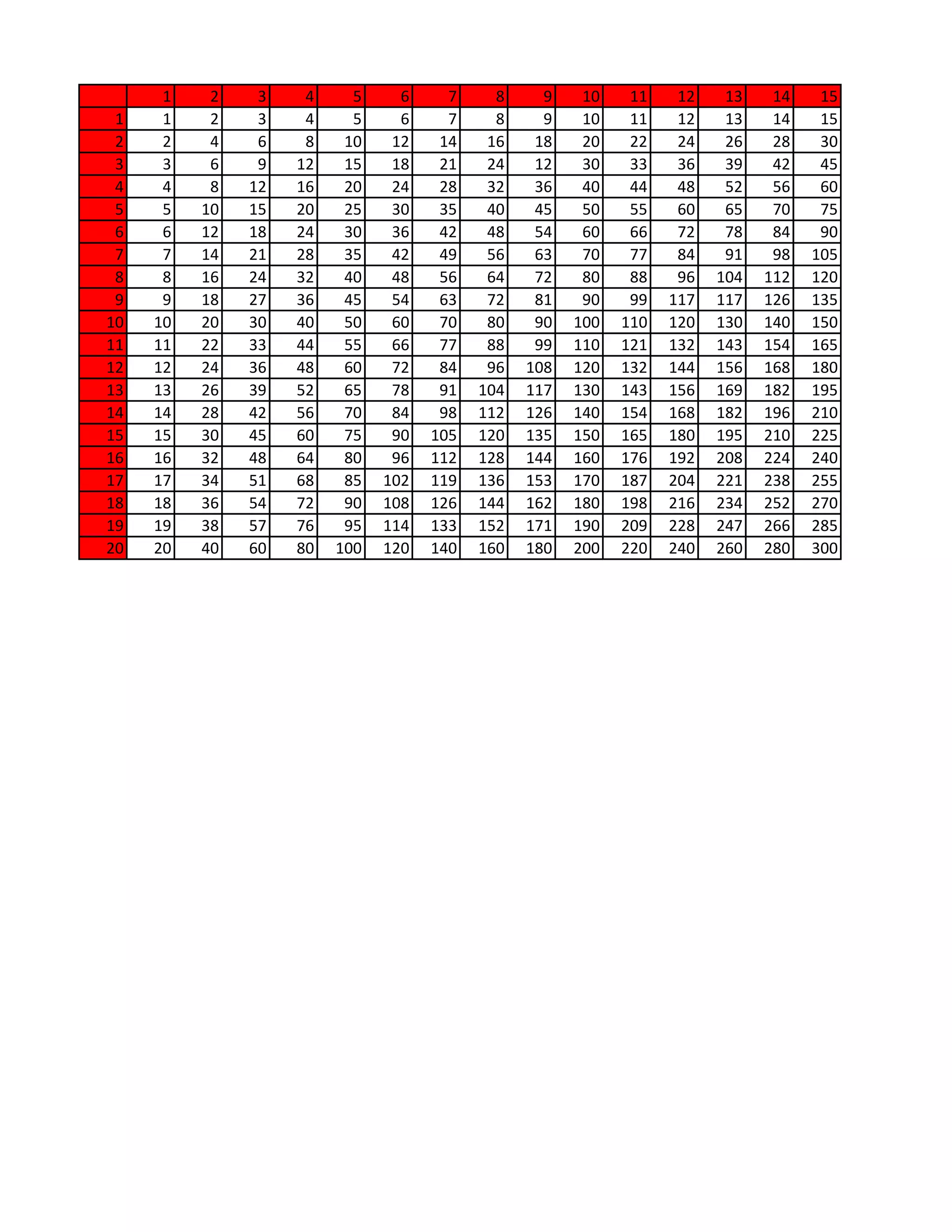 Le document présente des séquences de nombres croissants et des multiplications sur une échelle allant de 1 à 400. Il s'agit principalement d'une liste organisée de produits numériques, indiquant des résultats arithmétiques successifs. Ces données semblent être utilisées pour un contexte éducatif ou de référence mathématique.