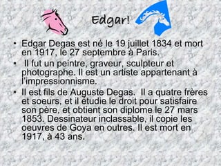 Edgar Degas, né le 19 juillet 1834 et mort en 1917, était un artiste avant-gardiste français, célèbre pour son travail en impressionnisme. Il était également sculpteur et photographe, et préférait des mediums tels que le pastel, la gouache et l’aquarelle, peignant souvent des danseuses et des chevaux. Degas est reconnu pour sa capacité à capturer des moments peu gracieux dans la danse, révélant la beauté des instants fugaces.