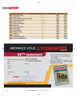 Le document présente un classement des entreprises en Tunisie selon leur chiffre d'affaires en milliers de dinars pour les années 2016 et 2017. Il inclut des informations sur divers secteurs d'activité tels que l'industrie, les services, et le transport aérien, et met en évidence les principaux acteurs du marché. Le document comporte également des données sur les exportations des entreprises, fournissant ainsi un aperçu des performances économiques de ces entités.