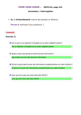Le document traite des règles de grammaire concernant l'interrogation en français, en soulignant l'importance de l'inversion sujet-verbe. Il fournit des exemples d'exercices sur la façon de former des questions en utilisant des pronoms appropriés et en tenant compte des particularités de la langue. Des conseils pratiques sur l'utilisation de structures formelles et de certains termes spécifiques sont également inclus.