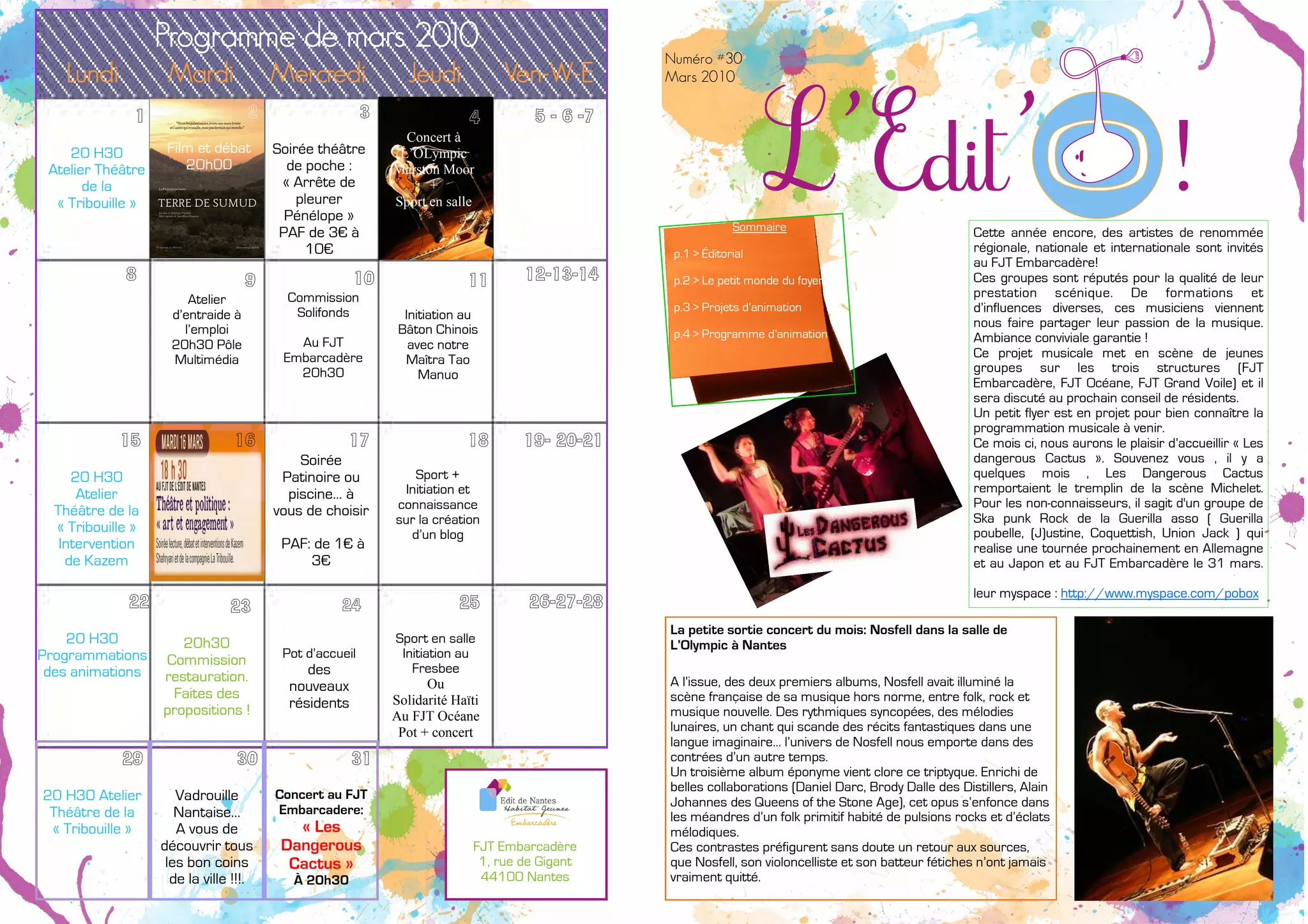 Le programme de mars 2010 annonce divers événements au foyer des jeunes travailleurs, incluant concerts, débats et ateliers, avec une mise en avant d'artistes locaux. Des initiatives d'entraide et des projets d'animation sont également mentionnés, tels que le soutien à l'emploi et la création de liens entre résidents. Un focus est mis sur l'engagement culturel et social, en particulier concernant la situation palestinienne.