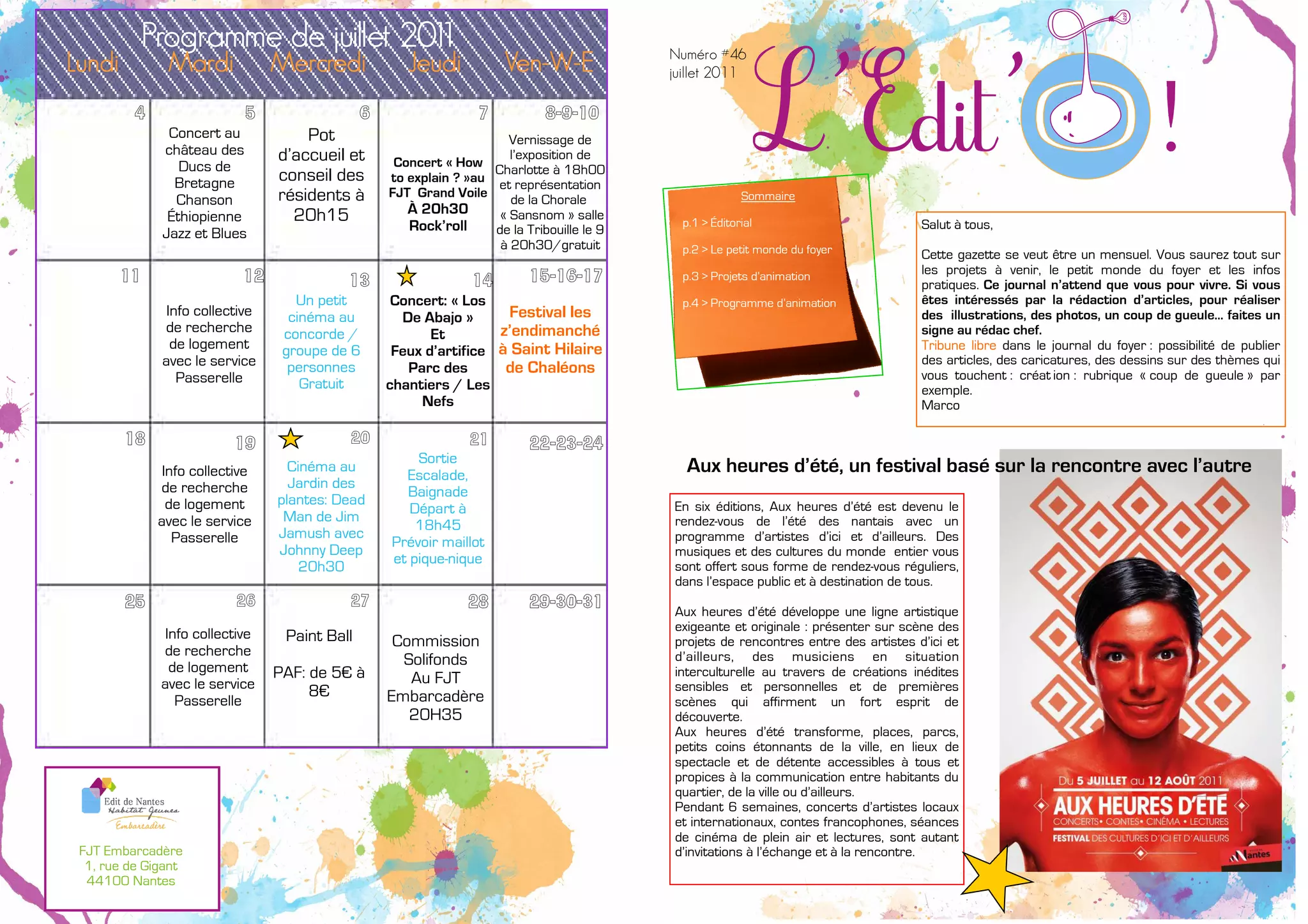 Le document présente un programme d'animation pour le mois de juillet 2011, comprenant divers concerts, projections de films, et activités culturelles au sein d'un foyer. Il met en avant l'importance de rencontres interculturelles et d'espaces accessibles pour favoriser l'échange entre résidents. En outre, des initiatives communautaires comme des ateliers de cuisine et des conseils de résidents sont également mentionnées.