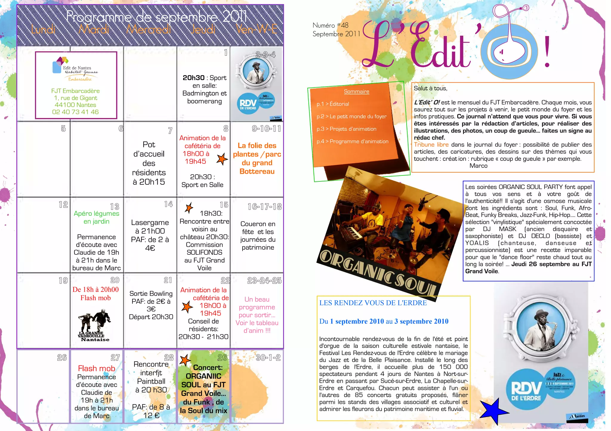 Le document présente le programme d'animations du foyer de jeunes travailleurs (FJT) pour septembre 2011, incluant diverses activités telles que des soirées musicales et des sorties. Il offre aussi des opportunités pour les résidents de s'impliquer dans la rédaction d'articles et l'organisation d'événements. Le tout vise à favoriser la convivialité et l'intégration des nouveaux résidents par le biais de projets collectifs.