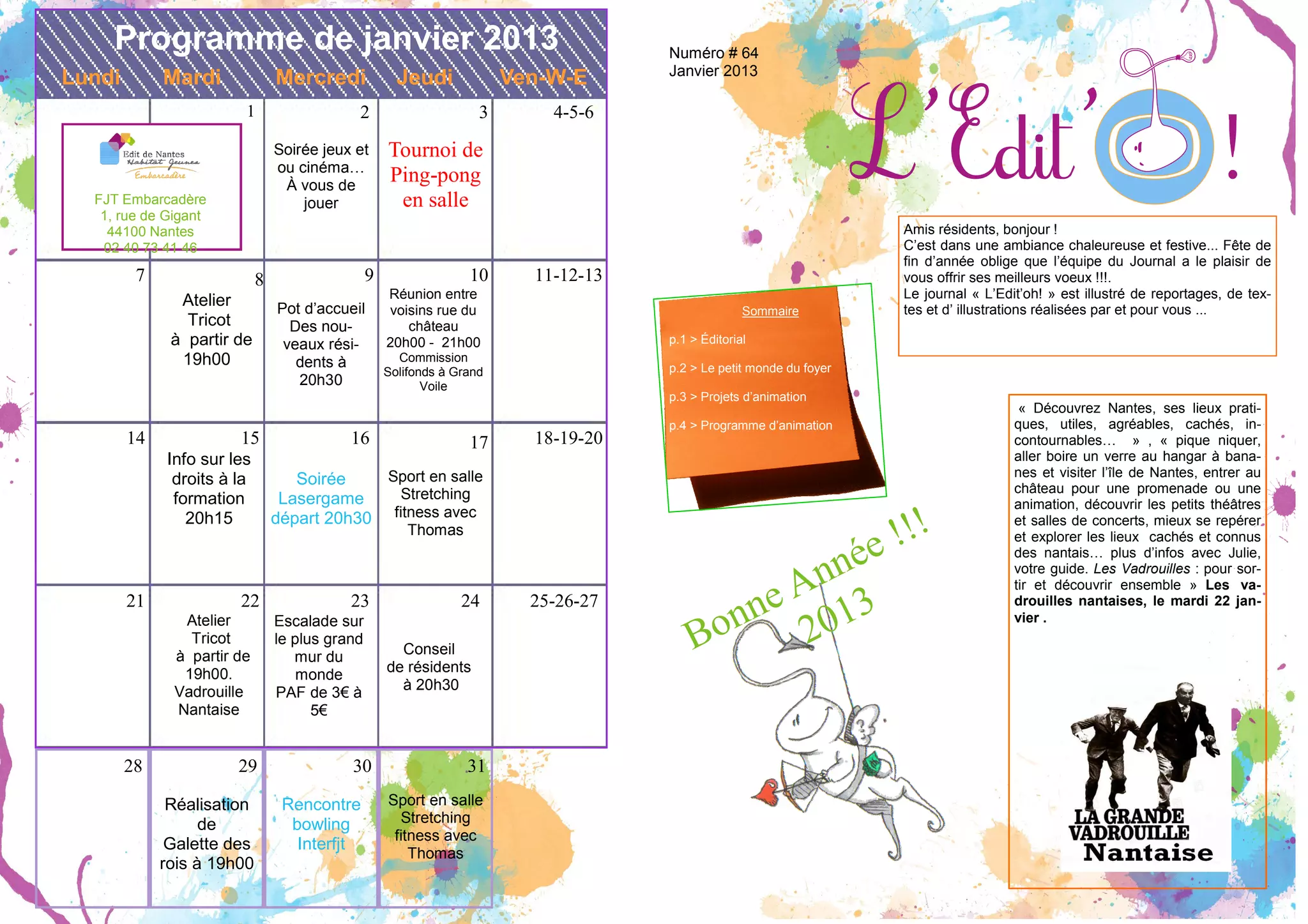 Le document présente le programme d'animations pour janvier 2013 au foyer des jeunes travailleurs à Nantes, incluant divers événements tels que des soirées jeux, des sorties et des ateliers. Il met également en avant l'importance de la commission des résidents pour discuter de la vie du foyer et organiser des projets collectifs. La fête de fin d'année a réuni plus de 45 participants pour célébrer dans une ambiance conviviale.