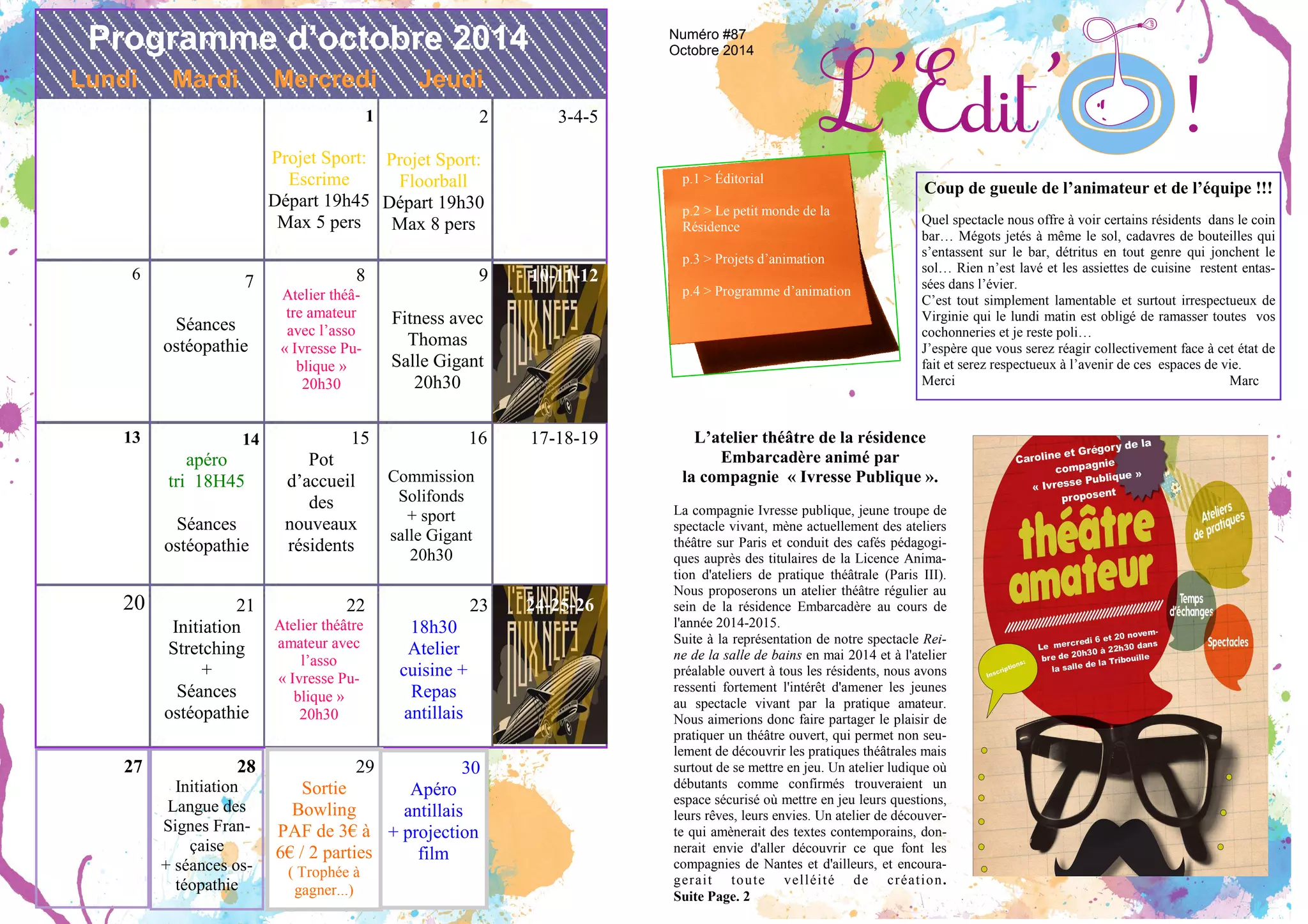Le document présente le programme d'animations d'octobre 2014 pour les résidents de la résidence Embarcadère, incluant des ateliers de théâtre, de cuisine, des sorties et des initiations à des disciplines variées comme la langue des signes ou l'ostéopathie. Il souligne l'importance de la participation collective et du respect des espaces communs, tout en offrant des opportunités pour les jeunes de la région à travers le pack 15-30. Les activités sont coordonnées par des animateurs locaux et incluent un événement d'accueil pour les nouveaux résidents.