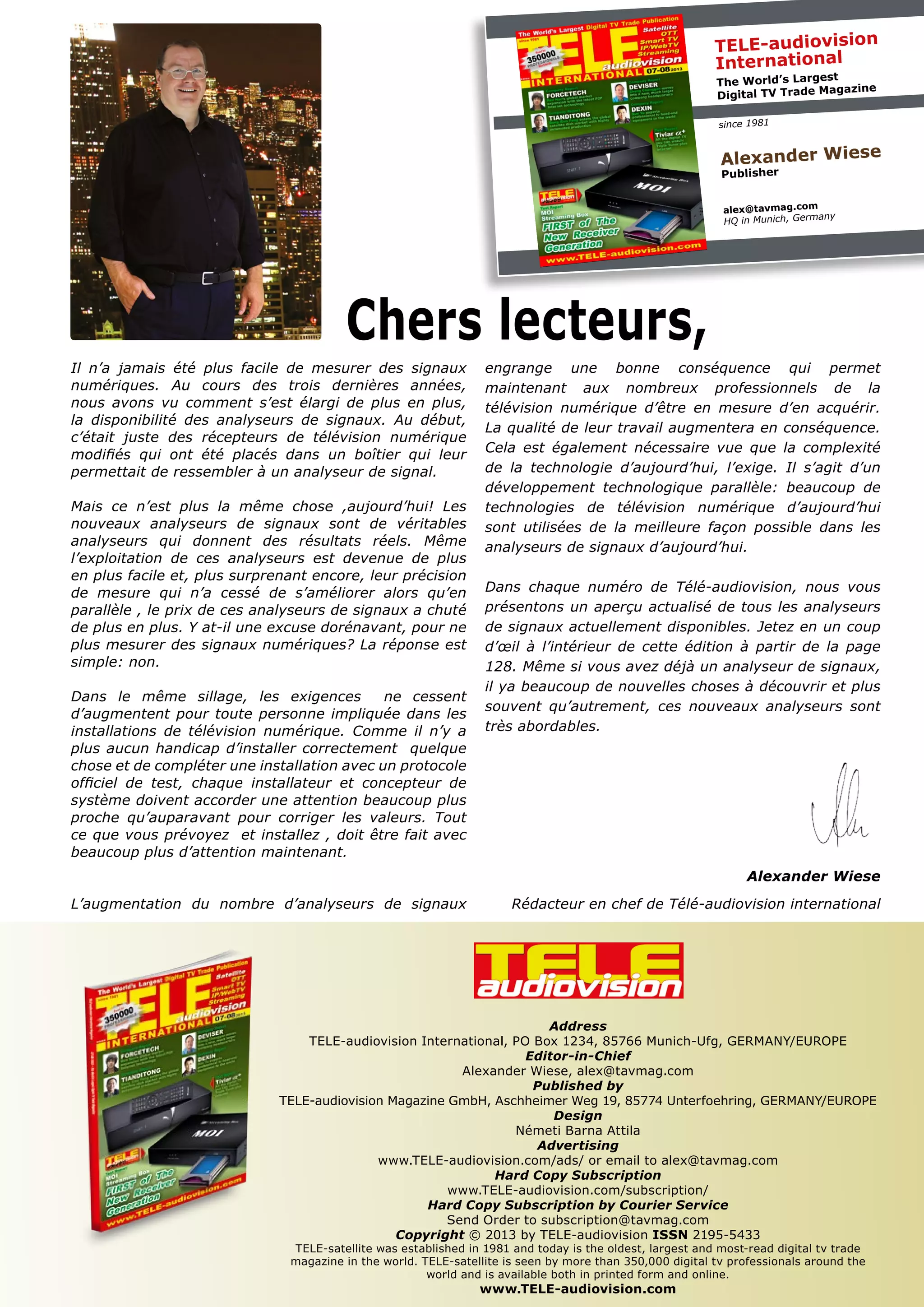 Tele-Audiovision International est la plus grande revue commerciale de télévision numérique au monde, fondée en 1981 et atteignant plus de 350 000 professionnels. Le document met en avant l'importance croissante des analyseurs de signaux numériques, qui offrent une précision de mesure améliorée à des prix en baisse, facilitant ainsi leur utilisation par les installateurs. Une attention accrue est nécessaire lors de l'installation de systèmes numériques en raison de la complexité technologique croissante.