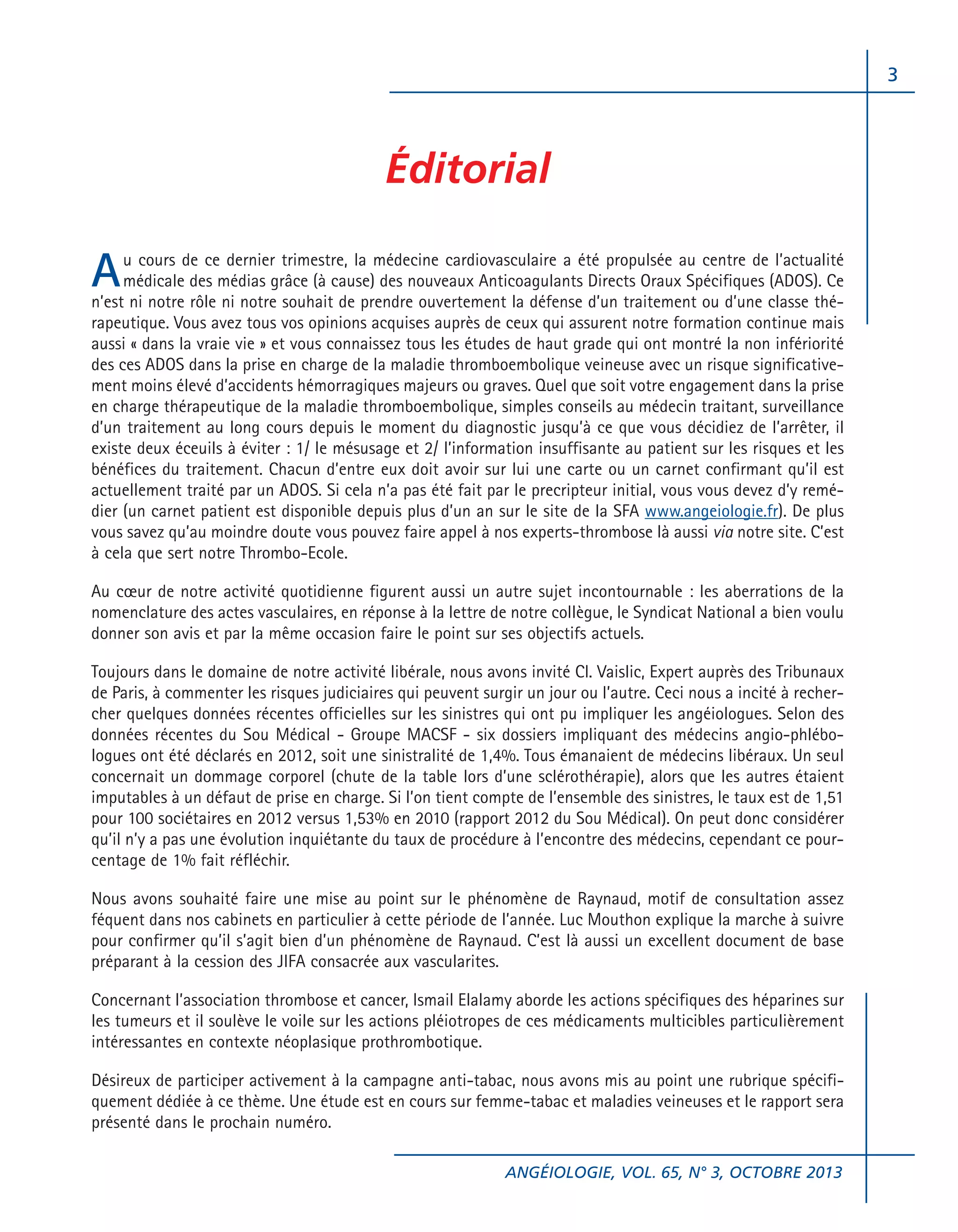 L'éditorial aborde les avancées en médecine cardiovasculaire, mettant l'accent sur les nouveaux anticoagulants directs oraux et leur efficacité dans la gestion des maladies thromboemboliques. Il souligne l'importance de bien informer les patients sur les traitements et évoque les statistiques sur les sinistres médicaux impliquant des angéiologues. Enfin, le document annonce un intérêt accru pour des sujets comme le phénomène de Raynaud et la relation entre thrombose et cancer, tout en invitant à participer aux 64es JIFA.