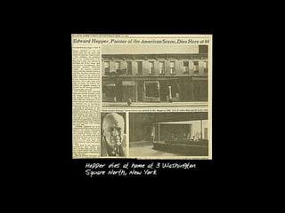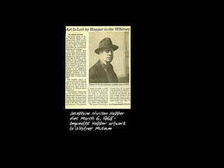 Le document présente une liste d'œuvres d'art et de photographies, principalement axée sur le travail d'Edward Hopper et d'autres artistes célèbres tels que Winslow Homer et Diego Rivera. Chaque entrée inclut des détails tels que les titres, les dates, les dimensions et les institutions d'accueil des œuvres. Il rend compte de l'évolution artistique entre le 19e et le 20e siècle aux États-Unis et en Europe.