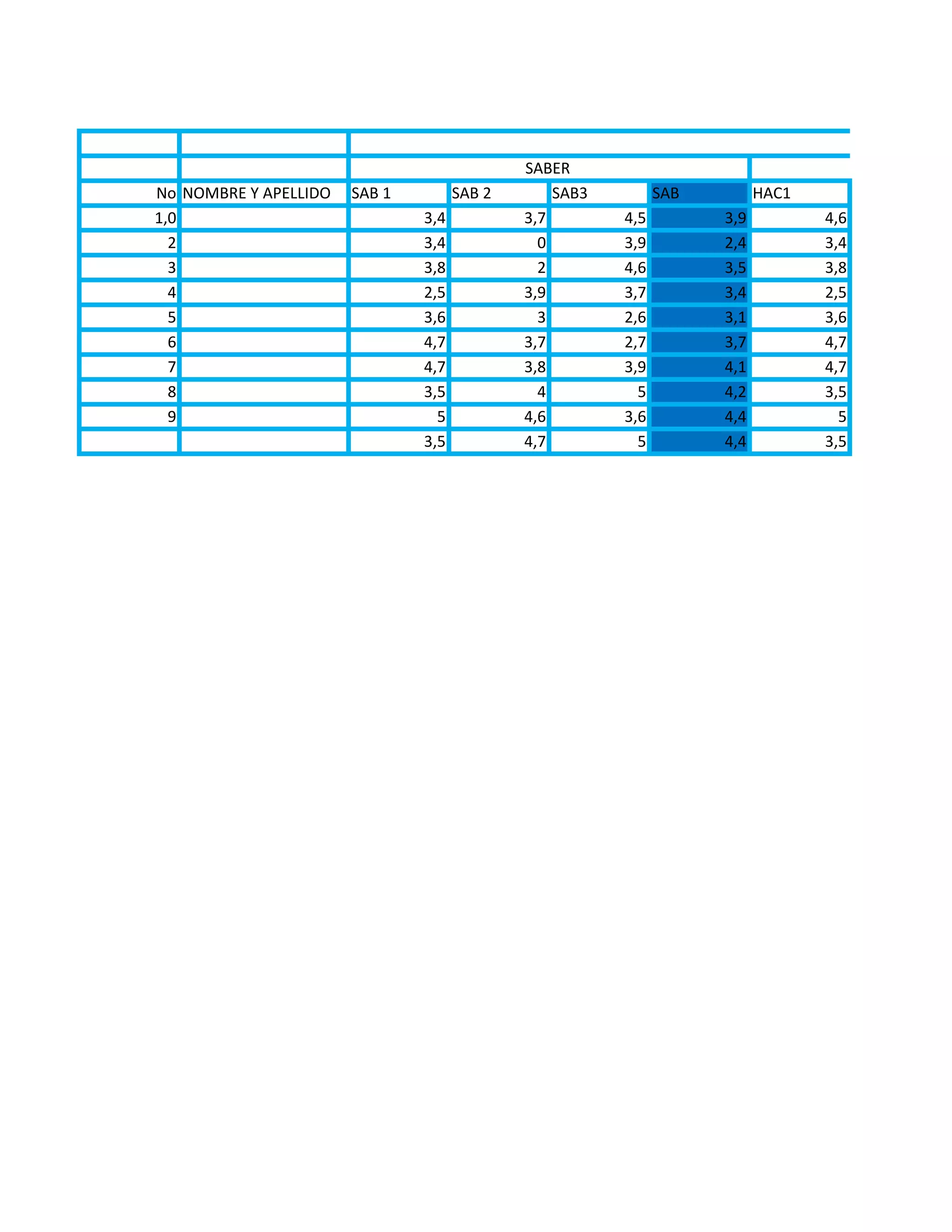 Le document présente des données quantitatives liées à des évaluations scolaires ou des implications académiques sur plusieurs périodes. Il liste les notes obtenues par des étudiants dans divers domaines tels que 'savoir', 'faire' et 'convivir'. Les résultats sont regroupés par périodes et incluent des moyennes, des scores individuels et des comparaisons entre différentes compétences.