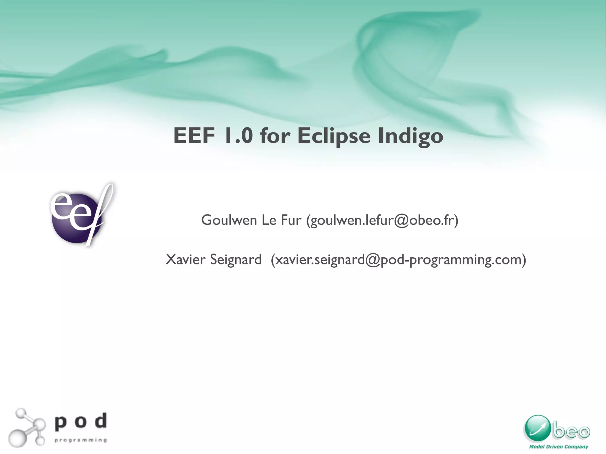 Le document présente le framework Extended Editing Framework (EEF) pour Eclipse, destiné à améliorer l'édition de modèles MDA. EEF permet une génération de vues plus attrayantes et des wizards/configurations pour faciliter la saisie des données. Il est disponible depuis Eclipse Helios et Indigo et vise à industrialiser l'édition de modèles.
