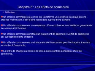 Le document traite des effets de commerce, définissant des instruments tels que la lettre de change et le billet à ordre, qui facilitent la transmission et le financement des créances. Il explique également la création, la comptabilisation et la circulation de ces effets, ainsi que les modalités de règlement et les problèmes potentiels comme les impayés. Enfin, il illustre ces concepts par des exemples pratiques de transactions commerciales.