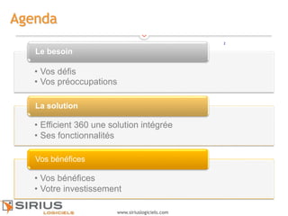 Le document présente Efficient 360, une solution intégrée de gestion des projets qui permet une planification, un suivi et un contrôle efficaces grâce à des fonctionnalités automatisées telles que la génération de livrables et la traçabilité. Elle promet des économies significatives en réduisant l'effort administratif et en accélérant le lancement des projets, tout en étant adaptable aux besoins spécifiques des utilisateurs. L'investissement est minimal, avec un coût d'utilisation de moins de 2$ par jour par utilisateur et aucun investissement technologique requis.