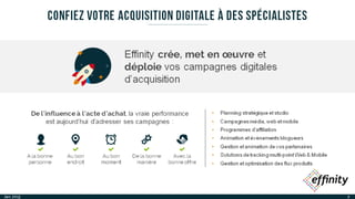 Effinity est une agence spécialisée dans l'acquisition digitale, offrant des solutions adaptées pour maximiser l'efficacité des campagnes publicitaires à travers divers canaux. Avec 15 ans d'expérience et un large réseau de partenaires, l'agence propose un suivi personnalisé et des stratégies de marketing ciblées pour optimiser la performance d'achat. Les experts d'Effinity évaluent et analysent les résultats des campagnes pour ajuster les actions en fonction des données de performance.
