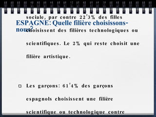 Le document compare le choix de filières d'études entre les garçons et les filles en Espagne et en France, mettant en évidence que les filles préfèrent les filières littéraires et sociales tandis que les garçons optent pour les filières scientifiques et technologiques. En ce qui concerne l'achèvement des études, les filles réussissent mieux que les garçons, tant en Espagne qu'en France. Cependant, les hommes trouvent plus facilement un emploi par rapport aux femmes dans les deux pays.