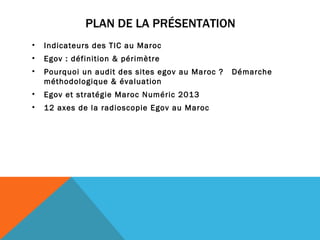 Ce document présente une analyse de l'état de l'administration électronique (egov) au Maroc, soulignant des défis majeurs tels que la vulnérabilité des sites publics aux cyberattaques et l'hétérogénéité de leurs contenus. Il met en lumière les insuffisances en matière d'accès à l'information, d'interactivité et de services transactionnels, tout en constatant un classement relativement bas du Maroc dans les indices mondiaux d'e-gouvernement. Enfin, des recommandations sont suggérées pour améliorer la confiance numérique et l'efficacité des services en ligne offerts aux citoyens.