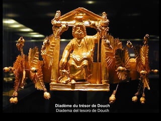 Le document décrit divers objets funéraires et artefacts associés à Toutânkhamon, y compris des sarcophages, des statues, et des trésors en or. Il mentionne des éléments emblématiques comme le masque funéraire en or et le trône de Toutânkhamon, ainsi que des divinités comme Amon et Horus. L'ensemble reflète la richesse de la culture égyptienne ancienne et les pratiques liées à l'au-delà.