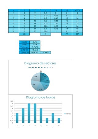 Le document présente divers calculs statistiques, y compris une moyenne de 3,95, une mode de 3 y 4, et une variance de 3,7475. Il inclut également des graphiques sous forme de diagrammes de barres et de secteurs, illustrant des pourcentages variés. Les données semblent être liées à des séries numériques, avec des valeurs et des catégories spécifiques.