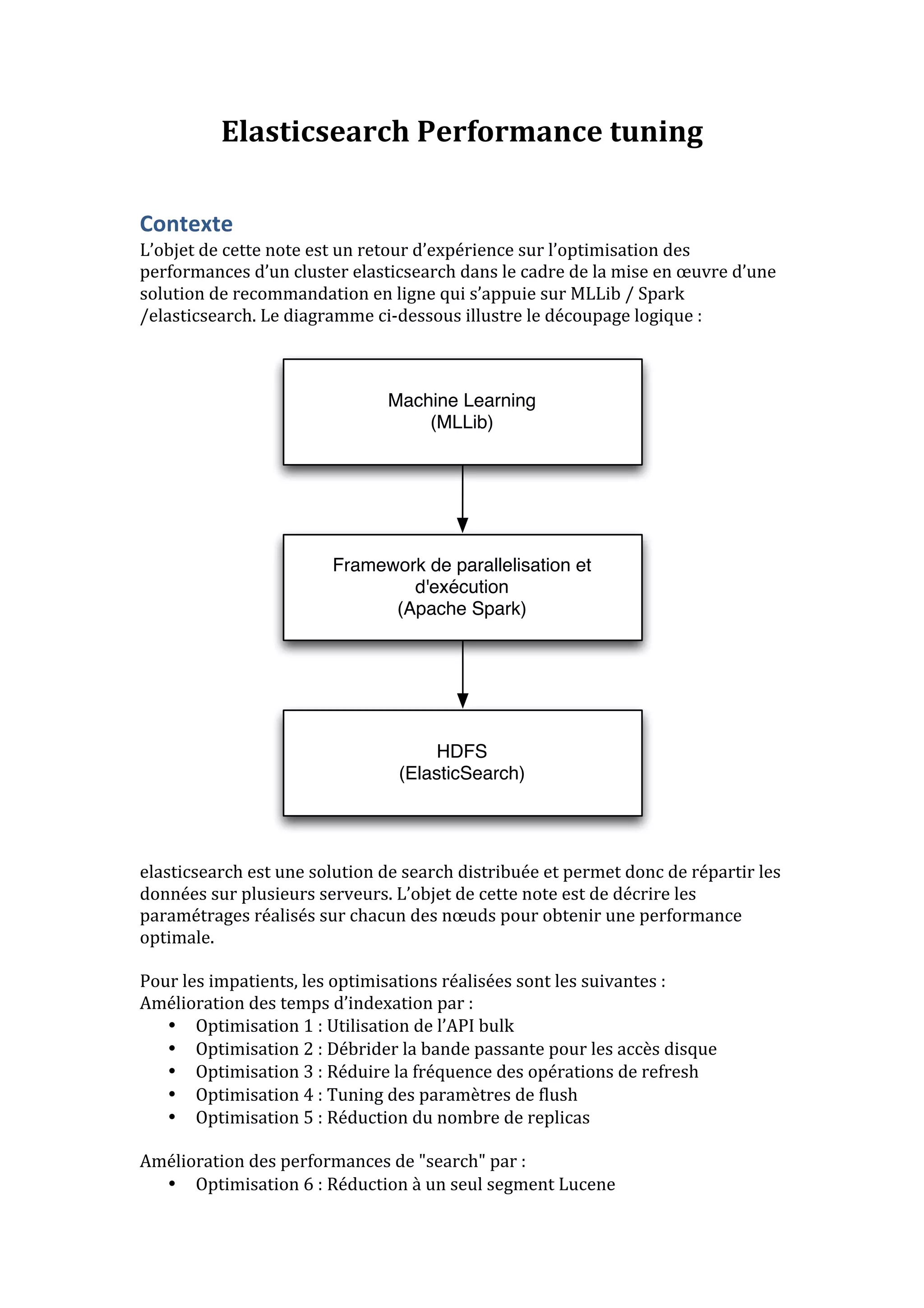 Ce document décrit les optimisations de performances d'un cluster Elasticsearch dans un contexte de recommandation en ligne, en mettant l'accent sur les paramétrages réalisés pour améliorer l'indexation et la recherche. Dix optimisations clés sont abordées, dont l'utilisation de l'API bulk pour l'indexation, la réduction des réplicas, ainsi que le tuning des paramètres de cache et de JVM. Les recommandations peuvent s'appliquer à d'autres contextes en dehors du big data.
