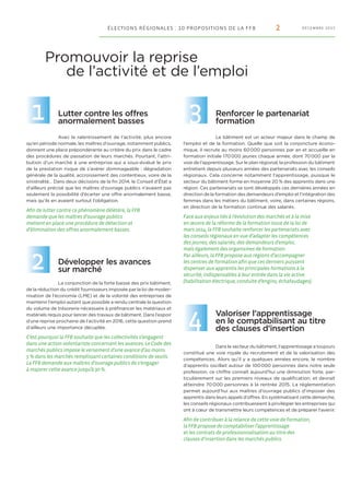 La Fédération Française du Bâtiment (FFB) propose dix mesures aux régions lors des élections de décembre 2015 pour soutenir le secteur du bâtiment face aux défis économiques, notamment en renforçant la commande publique et en favorisant la rénovation énergétique. Elle appelle à valoriser l'apprentissage, moderniser les entreprises et optimiser l'utilisation des fonds européens pour dynamiser l'emploi et l'activité. Les propositions visent également à préserver le patrimoine et encourager des modes de construction durables au sein des territoires.
