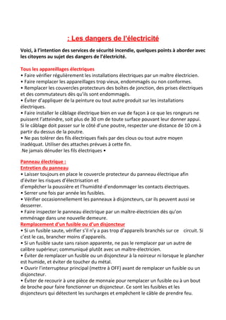 Ce document traite des dangers liés à l'électricité dans les bâtiments et fournit des recommandations pour assurer la sécurité électrique. Il aborde des sujets tels que l'entretien des installations électriques, l'utilisation appropriée des fusibles et des disjoncteurs, ainsi que des conseils sur l'installation sécuritaire d'appareils électriques. Il souligne également l'importance de faire appel à un électricien qualifié pour toute intervention sur le système électrique.