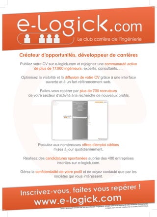 Le club carrière de l'ingénierie propose aux ingénieurs de publier leur CV sur e-logick.com pour améliorer leur visibilité et être contactés par des recruteurs. Les utilisateurs peuvent postuler à des offres d'emploi ciblées et gérer la confidentialité de leur profil. Avec plus de 400 entreprises inscrites sur la plateforme, les membres ont accès à de nombreuses opportunités de carrière.