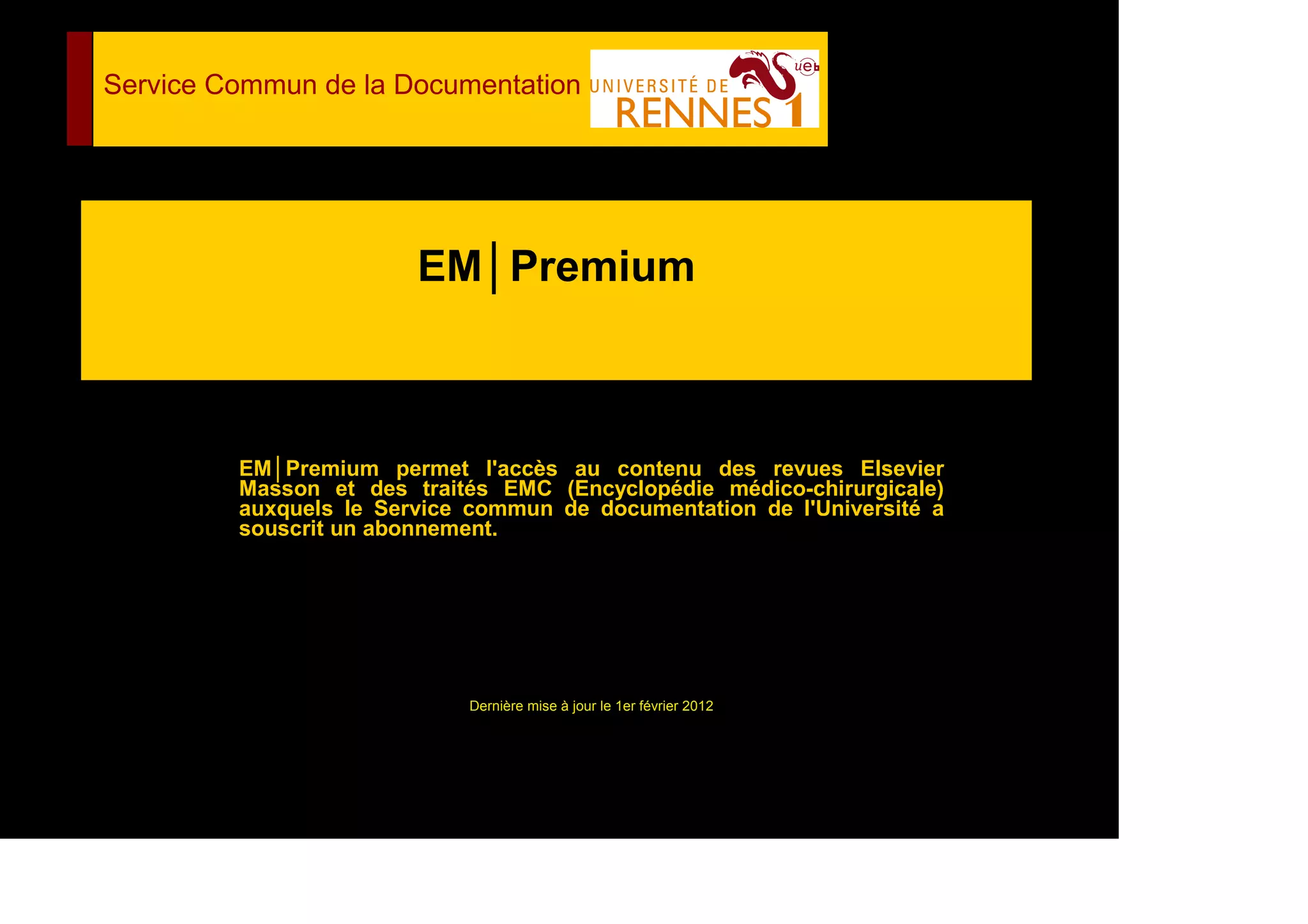 Le document décrit l'accès aux revues Elsevier Masson et aux traités de l'encyclopédie médico-chirurgicale via un abonnement souscrit par le service de documentation de l'université. Il présente les options de recherche, notamment la recherche simple et avancée, ainsi que l'accès aux fiches descriptives et aux sommaires des publications. Les utilisateurs peuvent également consulter les articles en texte intégral et recevoir des mises à jour par e-mail.