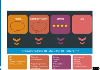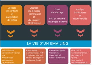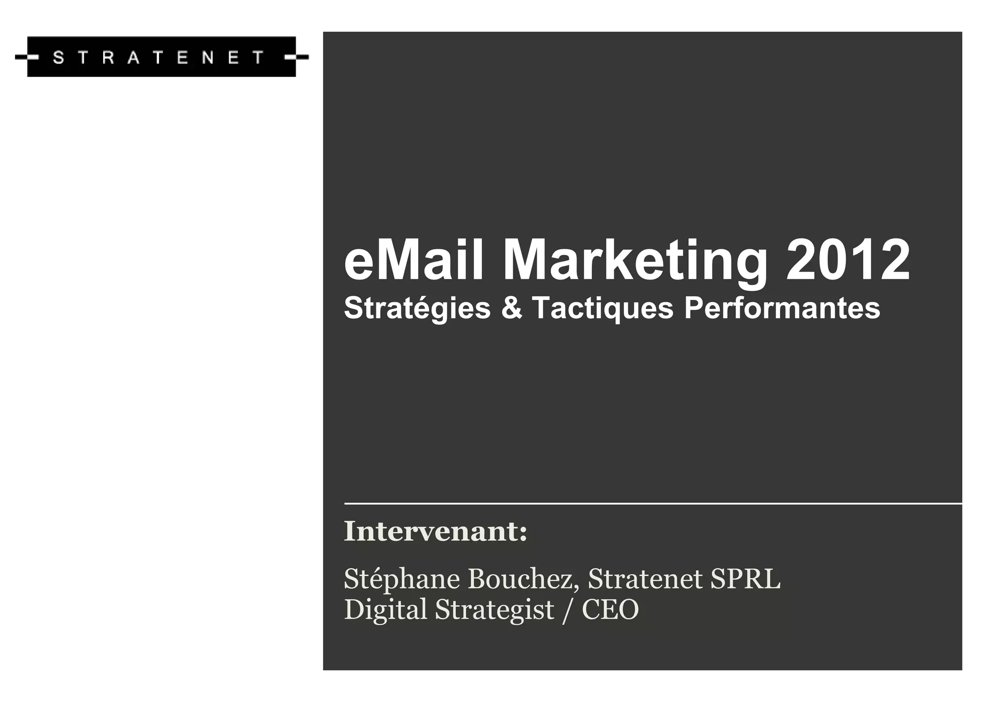 Le document présente les stratégies et tactiques de l'email marketing de 2012, soulignant l'importance d'utiliser l'email comme un outil pour générer des leads qualifiés, engager les clients et personnaliser les communications. Il met en avant l'évolution de l'email marketing vers une approche centrée sur le comportement des utilisateurs et la nécessité de segmenter les audiences pour des campagnes plus efficaces. Enfin, le document aborde l'importance de mesurer l'engagement et d'automatiser les campagnes pour maximiser la pertinence et les conversions.