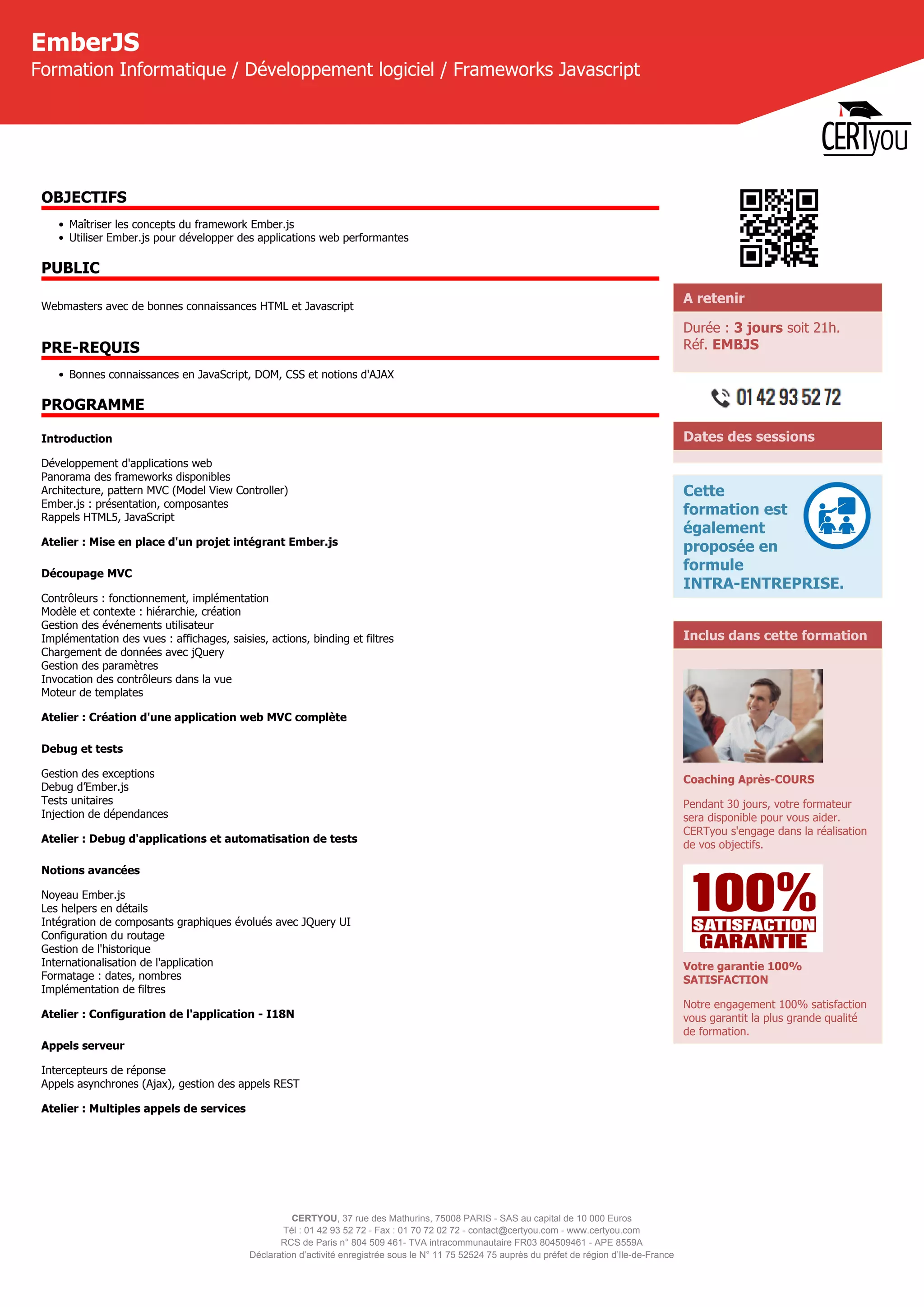 Certyou propose une formation de 3 jours sur le framework Ember.js pour les webmasters souhaitant développer des applications web performantes. Le programme couvre des concepts clés, l'architecture MVC, des ateliers pratiques et comprend un coaching post-formation de 30 jours. L'engagement de Certyou assure la satisfaction des participants à travers une formation de qualité.