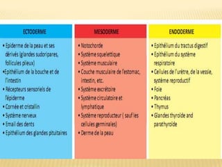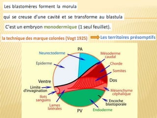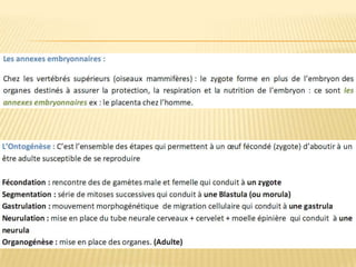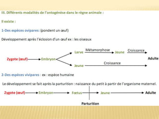 Le document traite des différents types de segmentation embryonnaire, y compris la segmentation totale et partielle, ainsi que des processus liés à la gastrulation et à l'organogenèse. Il mentionne également la norulation et la métamorphose. Les exemples incluent divers groupes d'organismes tels que les insectes, les oiseaux et les reptiles.