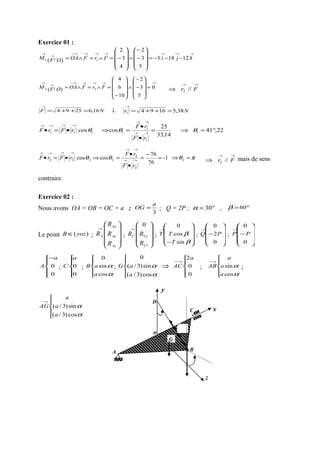 Le document est un exercice de mécanique rationnelle destiné aux étudiants de la faculté des sciences de l'université de Boumerdes pour l'année académique 2000-2001. Il contient des problèmes relatifs à la détermination des moments de force, des équations d'équilibre statique pour des systèmes mécaniques, et le calcul du centre d'inertie à l'aide de théorèmes et d'intégration. Les exercices abordent divers aspects de la mécanique, tels que l'application de forces et les relations géométriques dans des configurations spécifiques.