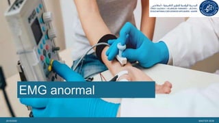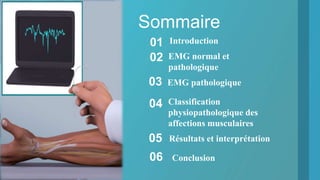 Le document détaille l'électromyogramme (EMG) comme un examen clé en neurologie pour analyser l'activité électrique des nerfs et des muscles, permettant de diagnostiquer diverses pathologies comme les neuropathies et myopathies. Il explique les différences entre EMG normal et pathologique et présente une classification des affections musculaires selon leur physiopathologie. Enfin, il souligne l'importance des résultats de l'EMG pour déterminer des diagnostics précis et orienter vers les causes sous-jacentes des maladies nerveuses et musculaires.