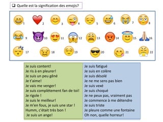 Le document présente une variété d'expressions émotionnelles, allant de la joie à la colère, ainsi que des références aux emojis et leur signification. Il inclut également des exercices pour compléter des phrases et identifier des images liées à la culture belge. L'ensemble reflète un état d'esprit ludique et informel.