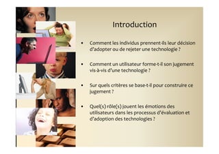 Ce document explore le rôle des émotions dans l'adoption et l'évaluation des technologies par les utilisateurs. Il souligne que les émotions influencent les décisions, la perception de l'utilisabilité et l'expérience utilisateur, tout en se basant sur des recherches en psychologie cognitive. Enfin, il évoque la notion d'informatique affective, visant à concevoir des systèmes capables de détecter et de réagir aux états émotionnels des utilisateurs.