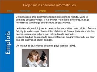 Le document traite des carrières dans le domaine des jeux vidéo, en se concentrant principalement sur le métier de testeur de jeux, ainsi que d'autres postes tels que programmeur technique, concepteur de jeux, animateur 2D/3D et chef de production. Chaque métier est décrit avec des informations sur les compétences requises, les salaires et les formations nécessaires. L'auteur exprime son intérêt pour devenir testeur de jeux vidéo en raison des faibles prérequis et de sa passion pour le jeu.