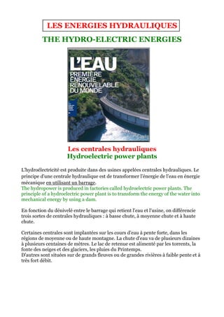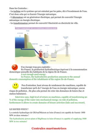 L'hydroélectricité est produite dans des centrales qui transforment l'énergie de l'eau en énergie mécanique grâce à des barrages. Les centrales peuvent être classées en fonction du dénivelé de l'eau, et l'énergie hydroélectrique représente 2,2 % de la production mondiale d'énergie. Les hydroliennes, qui utilisent l'énergie des courants marins, sont une source d'énergie émergente et fiable, avec un potentiel significatif en France.