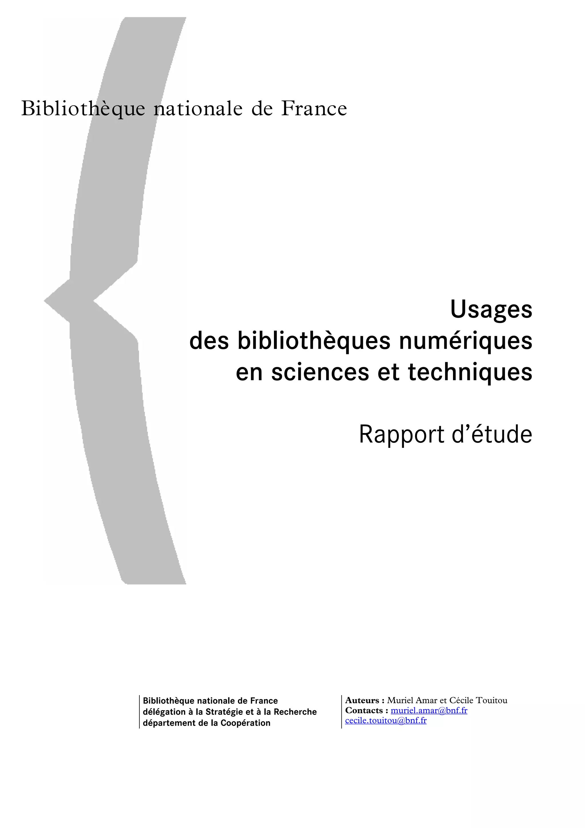 Cette étude évalue les usages des bibliothèques numériques spécialisées en sciences et techniques en lien avec Gallica, la bibliothèque numérique encyclopédique de la BNF. Il en ressort que les chercheurs préfèrent les bibliothèques de niche, qui répondent spécifiquement à leurs besoins documentaires, malgré une utilisation intensive de Gallica. Les résultats montrent également une méfiance envers les outils techniques modernes et une plus grande demande pour des contenus de qualité plutôt que des fonctionnalités avancées.