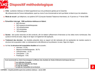 L'enquête examine la pénibilité des auxiliaires médicaux en libéral en France, ciblant cinq professions gérées par la Carpimko. Réalisée par téléphone entre le 15 janvier et le 1er février 2008, l'étude a interrogé 1500 professionnels avec un échantillon comprenant infirmiers, masseurs-kinésithérapeutes, orthophonistes, orthoptistes et podologues. Des quotas ont été établis pour garantir une représentation adéquate des différents groupes professionnels.