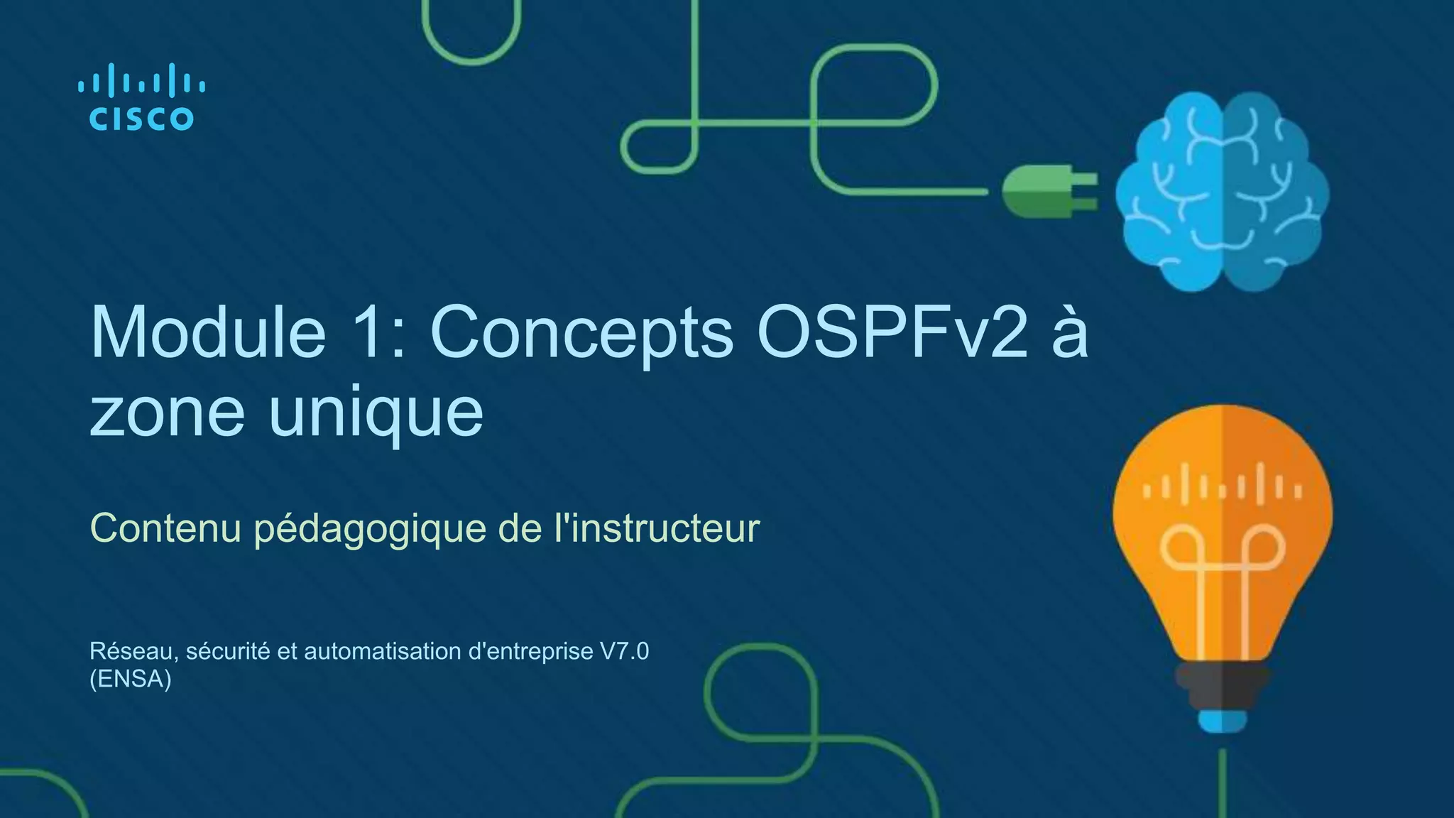 Le module 1 sur OSPFv2 à zone unique couvre les concepts essentiels du protocole OSPF et ses caractéristiques, y compris les types de paquets utilisés pour échanger des informations de routage. Il inclut des activités d'apprentissage interactives et des évaluations pour aider les étudiants à évaluer leur compréhension. Ce module met l'accent sur l'importance de la conception de zones pour la scalabilité et l'efficacité dans les réseaux.