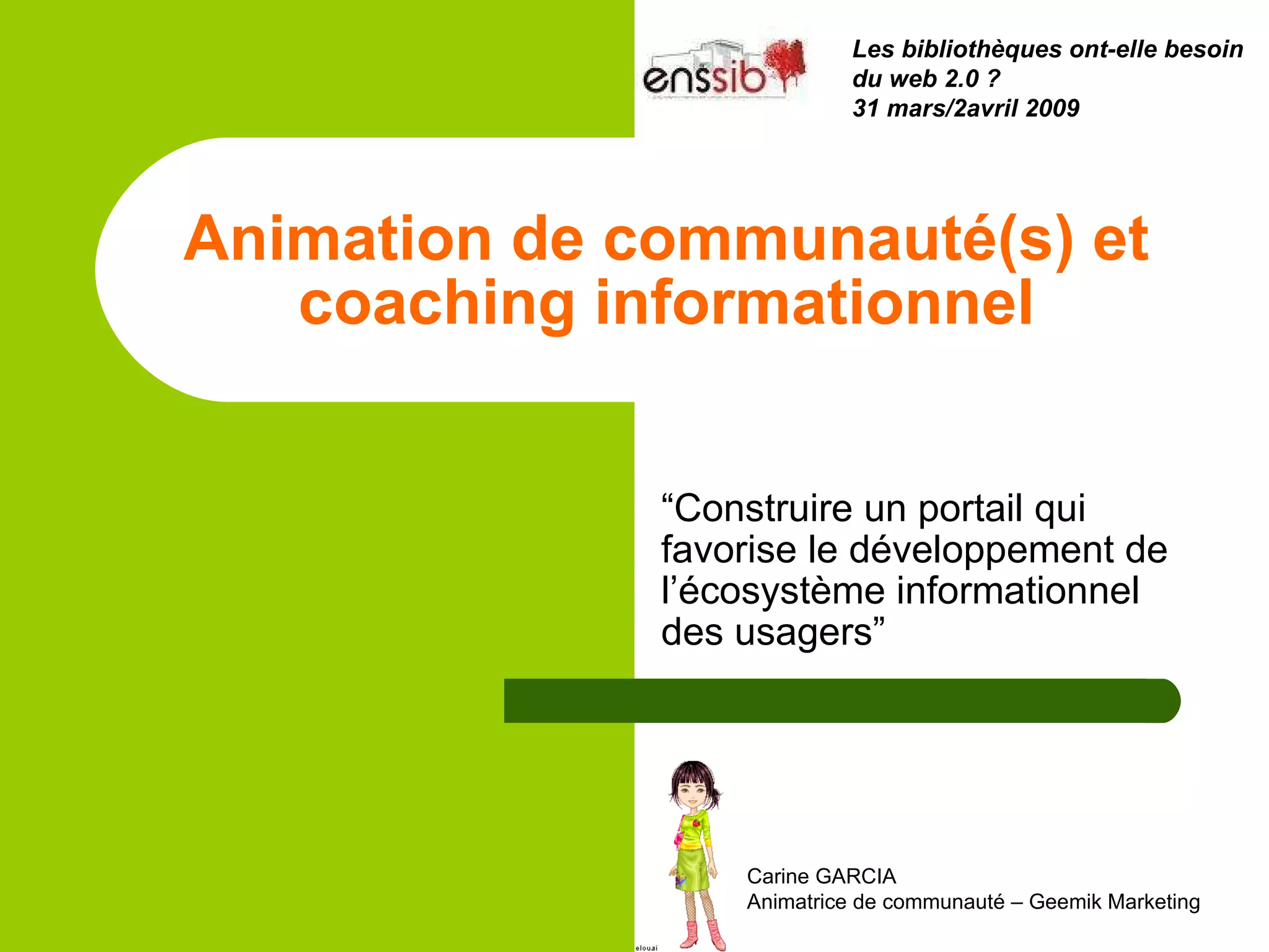 Le document traite de l'animation de communautés et du coaching informationnel dans le contexte des bibliothèques et des écoles de commerce, notamment à l'ESC Lille. Il aborde l'importance du web 2.0 et des nouveaux outils numériques pour favoriser le partage de connaissances et l'interaction entre les différents publics, comme les étudiants, les enseignants et les entreprises. Enfin, il décrit l'évolution vers un environnement virtuel et collaboratif, intégrant des services à valeur ajoutée pour enrichir l'expérience informationnelle des utilisateurs.
