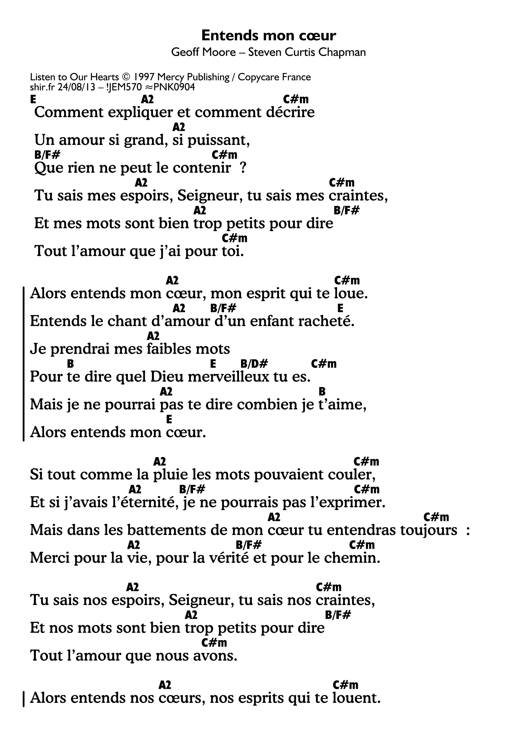 La chanson 'Entends mon cœur' exprime un amour profond et puissant envers Dieu, soulignant que les mots sont insuffisants pour en décrire l'ampleur. Les sentiments de gratitude pour la vie et la vérité sont répétés, avec un appel à ce que Dieu entende les cœurs et les louanges de ses rachetés. Les auteurs reconnaissent leur incapacité à pleinement exprimer leur amour, mais aspirent à partager leur admiration à travers des mots simples.
