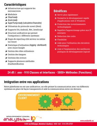 L'Enterprise Integration Platform (EIP) d'Analytik, développée grâce à 30 ans d'expérience en développement logiciel, permet d'accélérer la livraison de projets tout en respectant les budgets et en améliorant la qualité des livrables. La plateforme est modulable, compatible avec diverses technologies et intègre des pratiques de développement modernes, réduisant le temps de développement de 15% à 30%. Elle facilite également l'intégration transparente des systèmes, contribuant à un développement rapide d'applications tout en protégeant les investissements technologiques.