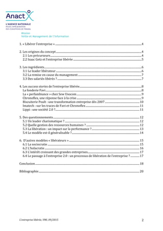 Le document explore le concept de l'entreprise libérée, qui encourage l'autonomie et la responsabilité des salariés dans la prise de décisions, visant à améliorer la motivation et la performance. Isaac Getz, suivi par d'autres dirigeants, a popularisé ce modèle en France, soulignant l'importance d'un leadership qui favorise un environnement de confiance et de collaboration. Plusieurs exemples et questionnements sont présentés, reflétant les conditions de succès et les défis liés à la mise en œuvre de ce modèle organisationnel.