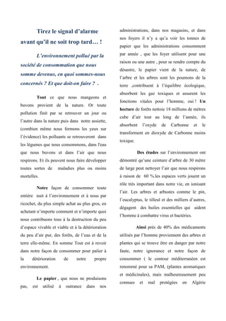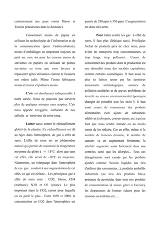 Le document alerte sur la pollution causée par nos modes de consommation et leur impact sur la santé humaine ainsi que sur l'environnement. Il appelle à une révision de nos comportements, notamment en réduisant l'utilisation de papier, en privilégiant les produits locaux, et en évitant les biens de consommation non durables. L'auteur insiste sur l'urgence d'éduquer les futures générations à des pratiques de consommation plus respectueuses de la nature pour assurer la survie de l'humanité.