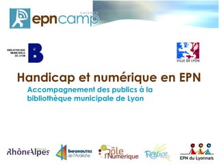 Le document aborde l'accompagnement des personnes en situation de handicap dans les Espaces Publics Numériques (EPN) à la bibliothèque municipale de Lyon, en soulignant l'importance d'adapter la communication et les outils numériques selon les différents types de handicap. Des équipements spécifiques, des ressources pédagogiques et des techniques de communication adaptées sont présentés pour les déficients visuels, sourds et malentendants, ainsi que pour les personnes handicapées moteurs. Les professionnels doivent veiller à créer un environnement d'apprentissage accessible et inclusif.