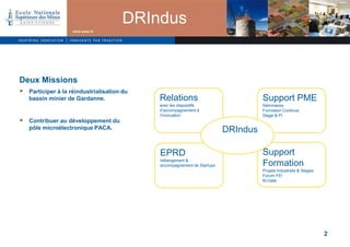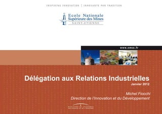 Le document présente les missions et réalisations de la délégation aux relations industrielles en janvier 2012, mettant l'accent sur la réindustrialisation du bassin minier de Gardanne et le développement du pôle microélectronique PACA. Il inclut des projets soutenus, des taux d'occupation des bureaux, et des événements marquants de l'année, ainsi que des initiatives pour le soutien aux PME et aux activités de formation. Enfin, il souligne l'importance des collaborations et des actions communes avec divers acteurs de l'innovation.