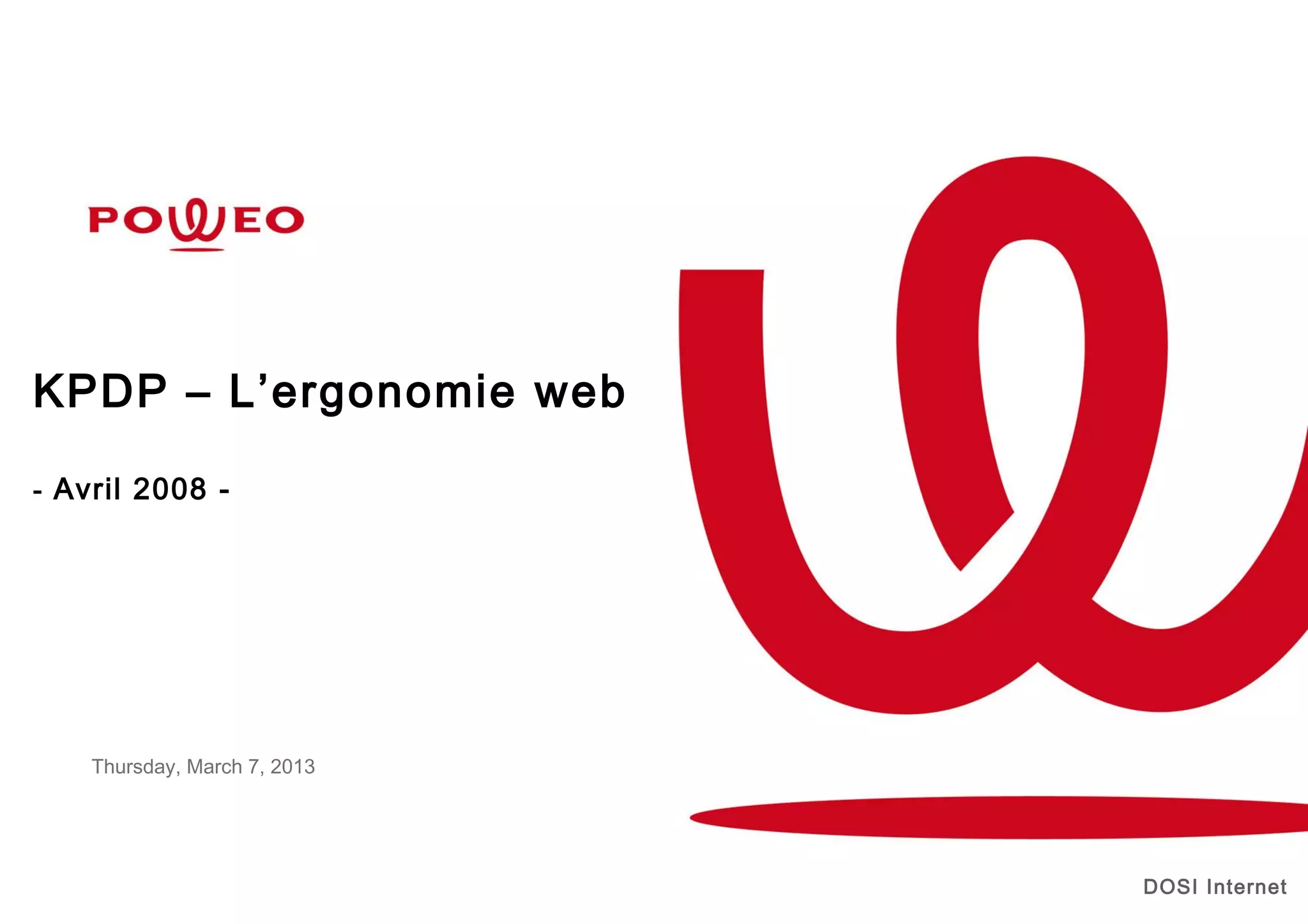 L'ergonomie web vise à adapter les sites internet aux besoins des utilisateurs pour faciliter leur navigation. Le document aborde des principes clés pour organiser une page web de manière lisible, notamment l'importance de la hiérarchisation de l'information et l'optimisation de la taille des éléments. Il recommande également des pratiques efficaces pour les formulaires et les liens, ainsi que des conseils pour éviter des erreurs courantes dans la conception web.