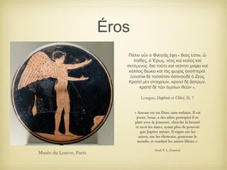 Ce document explore l'iconographie d'Éros, mettant en lumière des citations anciennes et des œuvres d'art qui illustrent le dieu de l'amour, associé à la beauté et à la jeunesse. Il évoque des récits mythologiques comme celui d'Éros et Psyché, illustrant le pouvoir de l'amour dans la gouvernance des cieux et des âmes. Des références à divers artistes et musées renforcent la représentation visuelle de ces thèmes dans l'art.