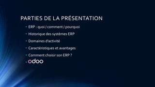 Le document présente le concept et l'historique des systèmes ERP (Enterprise Resource Planning), qui visent à centraliser les données et à améliorer l'efficacité des processus au sein des entreprises. Il détaille les avantages d'un ERP, y compris l'optimisation des coûts opérationnels, l'amélioration de la collaboration et des prévisions plus précises. Le texte fournit également des conseils pour choisir un ERP adapté aux besoins spécifiques d'une entreprise.